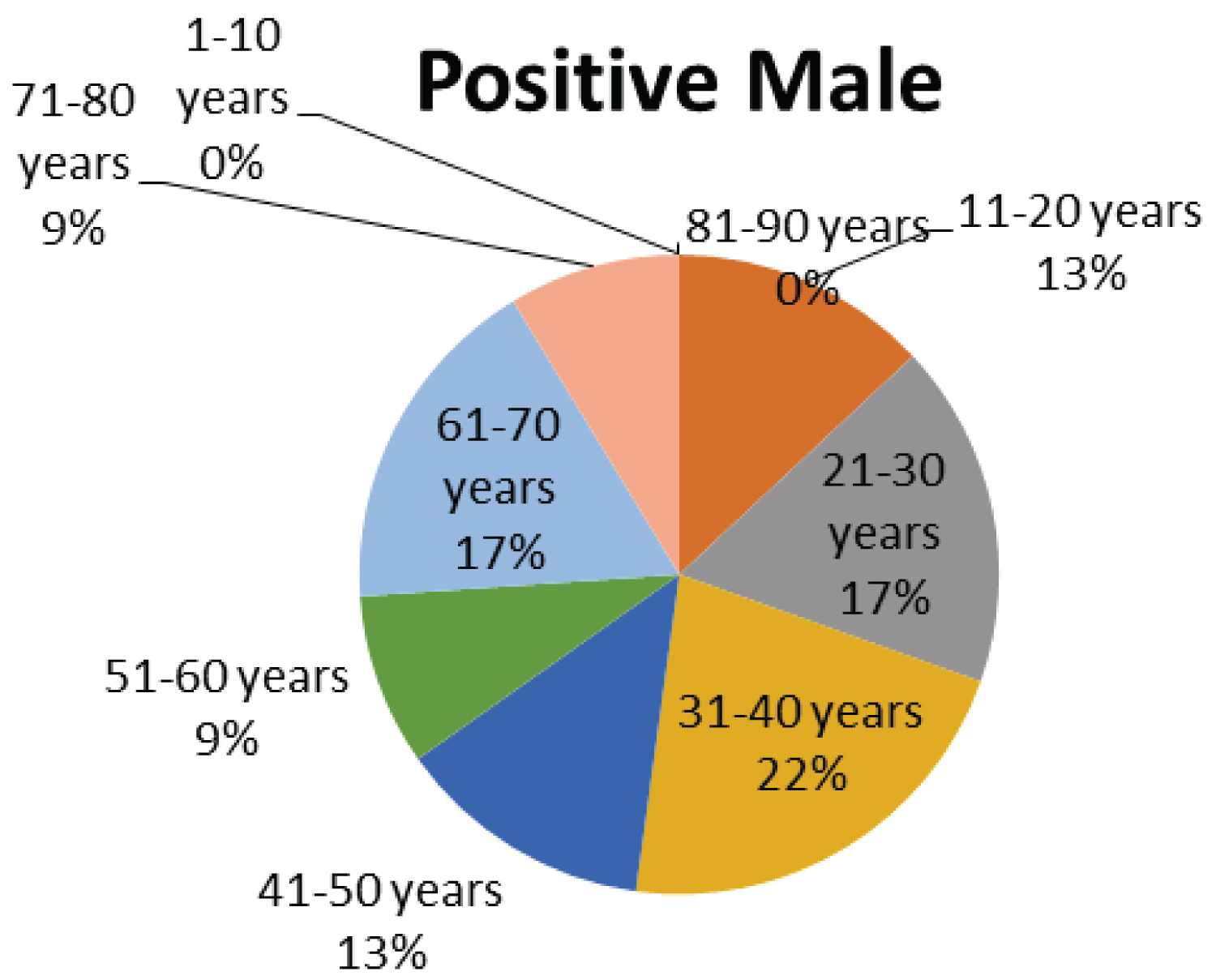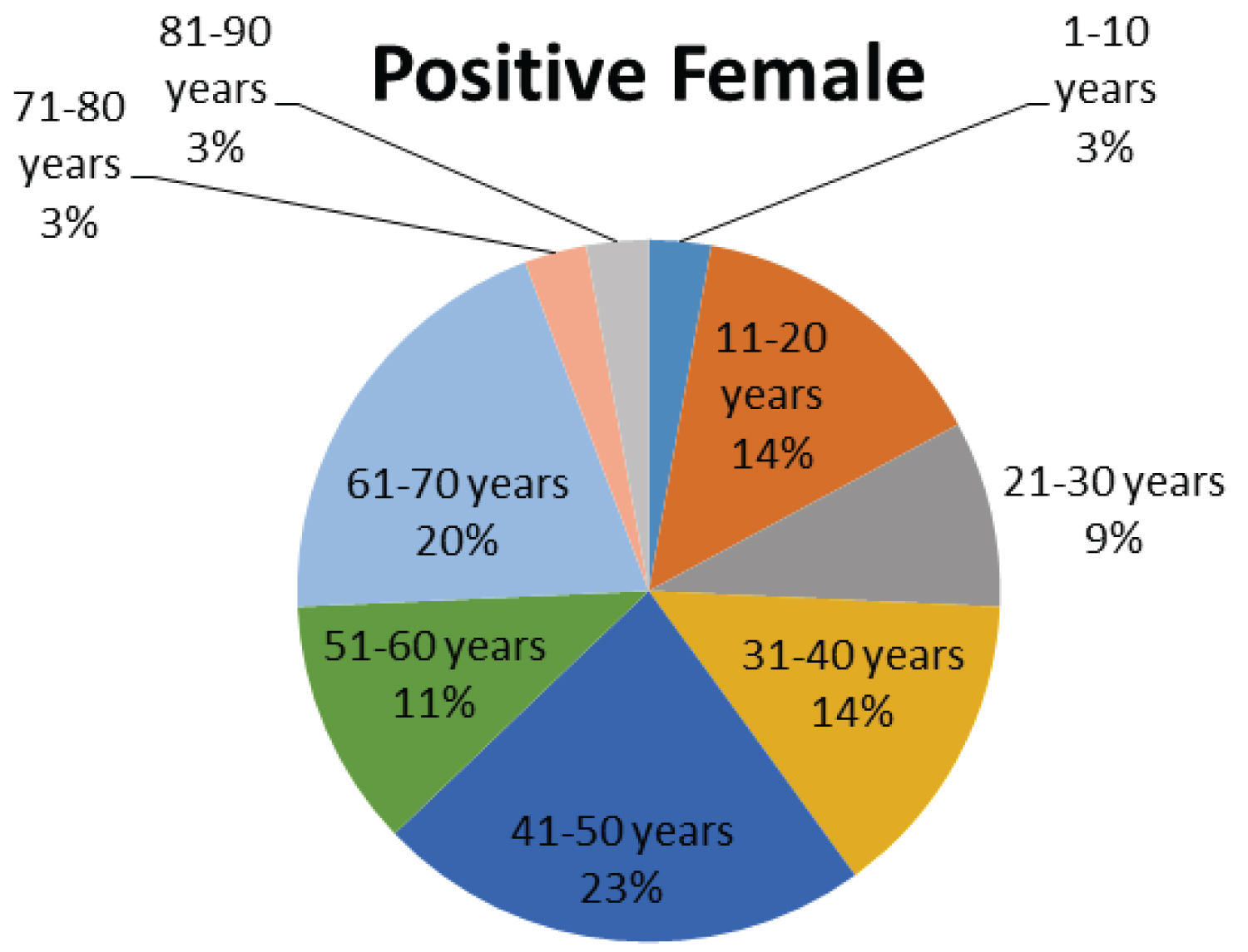Table 2 shows the study include (n = 254 cases), (58 sample 22.8%) show positive results by Quantiferon test while (196 sample 77.1%) show negative test. Females constituted 118 (46.4%) of the total cases (Figure 2), while the males constituted 136 (53.6%) (Figure 3). The age (31-40 years) for the negative includes (35 cases 13.7%) while (41-50 years and (61-70 years) for positive include (11 cases 4.3%).