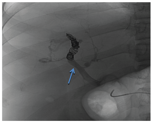 Figure 2: Post-coil embolization angiogram of the arterio-portal fistula. Flow through the fistula was greatly reduced but the fistula remained patent. Blue Arrow: Fistula between the right hepatic artery and right portal vein.