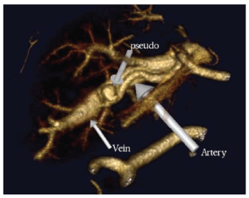 Figure 4: 3D volume rendering image showing the fistula between the left hepatic artery, left portal vein and the pseudo-aneurysm.