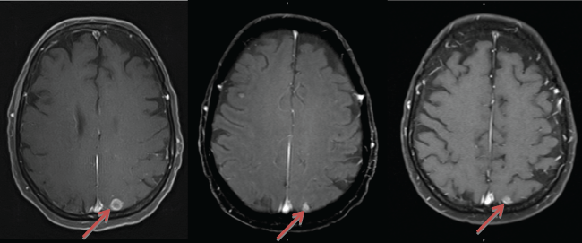 Figure 1: Brain MRI images showing regression and stabilization of parietal lesion with targeted chemotherapy. A) Lesion in December 2013, after WBRT (11.4 mm × 10.8 mm). B) Lesion after 3 months of targeted chemotherapy (March 2014), now measuring 6.1 mm × 7.8 mm. C) Continued stabilization and regression of the lesion after 7 months of targeted chemotherapy (July 2014), measuring 5.8 mm × 7.1 mm.