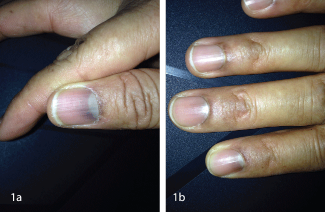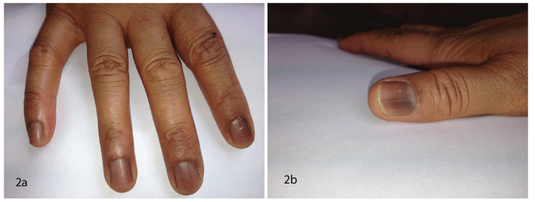 The patient was then given CyF 2 mg/kg/day (100 mg/day). At day 15th after the beginning of CyF she complained of her nails turning to a blue color (Figure 1a and Figure 1b), which became complete and diffuse at day 30th (Figure 2a and Figure 2b). CyF was discontinued after 90 days. The discoloration of the patient's nails progressively disappeared and 5 months later her nails were normal again (Figure 3).