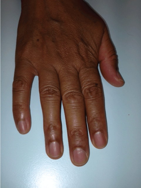 Kumar, et al. [4] reported a patient who developed a pigmentation of his nails after six cycles of CyF, methotrexate, and 5-flourouracil chemotherapy for breast cancer. The nail pigmentation involved all the nails of both hands and feet except the second and third toenails of her right foot.