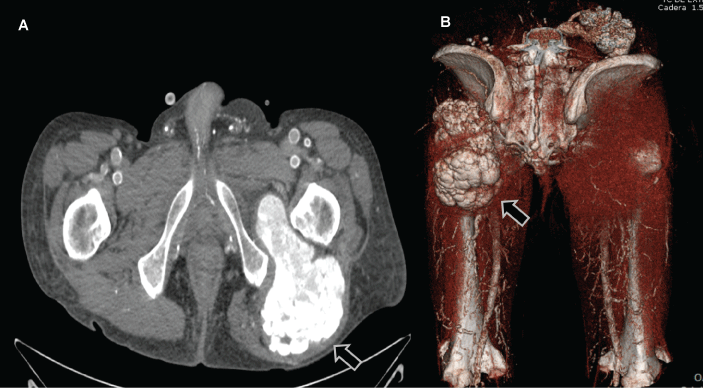 An axial computed tomography (CT) scan (Figure 1A) and posterior projection of 3D CT scan (Figure 1B) of the pelvic showed a lobular calcified mass on the left hip. The mean values of serum Ca, Ca adjusted for albumin, P, Ca x P product in the last year were 9.1 ± 0.7 mg/dl (8.7-10.3 mg/dl), 9.4 ± 0.3 (8.7-10.3 mg/dl), 5.9 ± 0.9 mg/dl (2.5-4.5 mg/dl), and 59.1 ± 6.9 mg2/dl2, respectively. The mean phosphatase alkaline (ALP) and iPTH levels were 130 ± 18 U/l (53-128 U/l) and 72.4 ± 22.2 pg/ml (12-65 pg/ml) respectively. After diagnosis of Uremic Tumoral Calcinosis (UTC), the patient was managed by intensified doses of PD associated with non-calcium-phosphate binders (lanthanum carbonate, 3 g/day). After 10 months the patient did not improve and the values of biochemical results was unchanged; probably by poor patient adherence to diet and dialysis prescription. Finally he was transferred to conventional HD (4 hours, 3 days a week) using low-Ca dialysate (2 meq/l). After six months clinical and radiological regression were observed (Figure 2A) with completely resolution after 12 months (Figure 2B). During this year on HD we observed a mild decreased of mean serum phosphate level (5.1 ± 1.5 mg/dl). Did not observe relevant changes in mean Ca adjusted for albumin (9.5 ± 0.2 mg/dl), iPTH levels (99.3 ± 42.4 pg/ml), and ALP (118 ± 16 U/l).