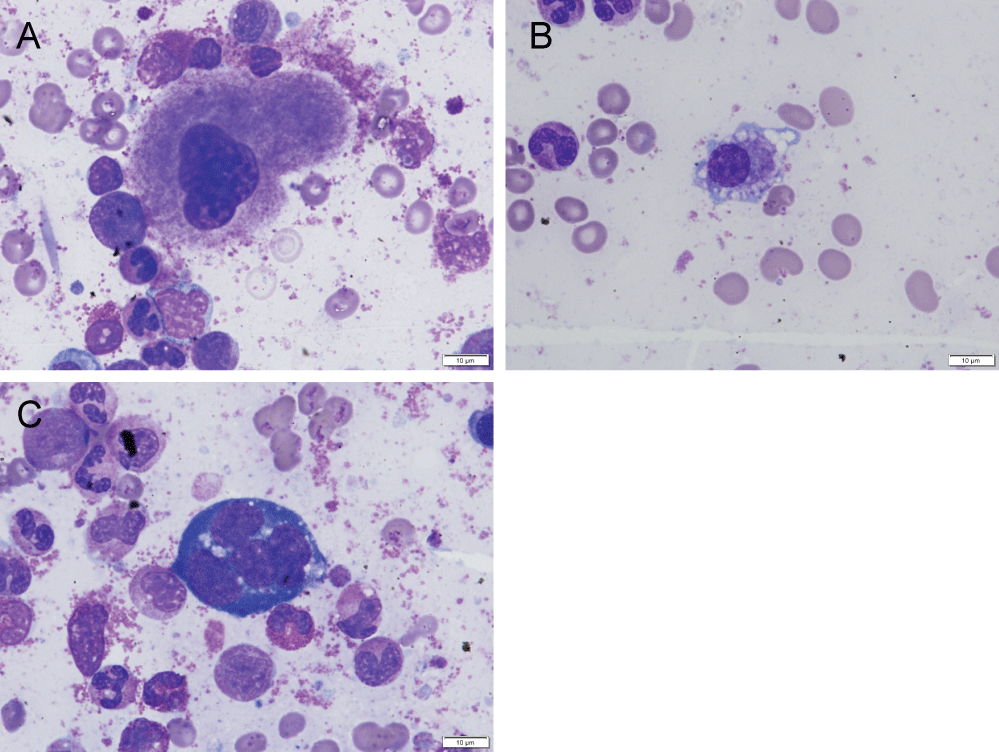 Figure 1: Pre-treatment blood marrow aspirate showing dyskaryopoiesis A) hypo-lobulated megakaryocytes; B) Micromegakaryocytes; C) Karyorrhexis. May Grünwald Giemsa.View Figure 1
