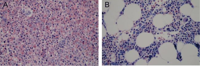 Figure 2: Bone marrow core biopsy. A) (pre-treatment) important cellularity (100%), granulocytic proliferation, increased eosinophils and dysmegakaryopoiesiss; B) (post-treatment) moderate cellularity (50%) without significant dysmyeloplasia, moderate eosinophilia. All three cell lines were represented in physiological proportion. Giemsa stain.View Figure 2