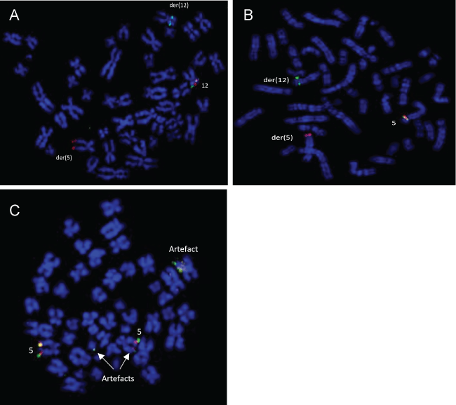 Figure 3: A) (pre-treatment): FISH using a dual-color ETV6 break-apart probe; B) (pre-treatment): FISH using a dual-color PDGFRB break-apart probe; C) (post-treatment): FISH using a dual-color PDGFRB break-apart probe, rearrangements is no longer visualized (sensitivity = 1 to 2% of all analyzed nuclei). FISH was performed using unstimulated cultured bone marrow cells.View Figure 3