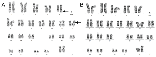 Figure 4: Karyotype of a metaphase from bone marrow aspirate A) (pre-treatment): t(5;12) reciprocal translocation (arrows); B) (post-treatment): absence of t(5;12)(q33;p13) reciprocal translocation. G-banded karyotype, 300 band resolutions, of cultured unstimulated bone marrow cells.View Figure 4