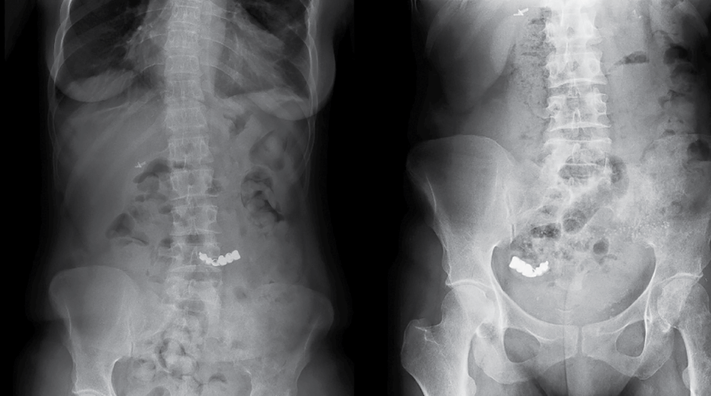 Figure 1: Abdominal X-ray showing the dental bridge lying in the stomach a couple of hours after ingestion (left panel), and moved onto the terminal ileum a week later (right panel). View Figure 1
