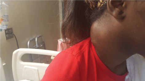 With her significant exposure to tuberculosis, with high suspicion of Tubercular adenitis, she was initiated on four-drug therapy empirically with Rifampin 600 mg PO daily (10 mg/kg), Pyrazinamide 1500 mg orally daily, Isoniazid 300 mg orally daily (5 mg/kg) along with Pyridoxine 50 mg orally daily, Ethambutol 800 mg orally daily. She did not have any pulmonary symptoms, was not able to produce sputum even on induction and her neck mass had no active drainage. We discussed with Infection Control and agreed that she did not require any airborne precautions. She was discharged in stable condition with a follow-up appointment. Her Mycobacterium tuberculosis complex Polymerase chain reaction (MTB-PCR) came back positive and susceptibility test by agar method revealed sensitive to all the first line drugs. She was seen in our clinic after two months and was tolerating treatment well with no side effects. Her neck mass was non-tender on exam and reduced in size. After 9 month follow up, swelling was completely resolved.