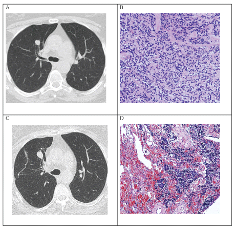 Figure 1: A) CT scan (from 2011) showing numerous small nodules bilaterally, one nodule 11 × 10 mm in size in the right upper lobe; B) Histopathology (from 2011) showing solid nests of slightly pleomorphic neuroendocrine cells; C) Follow-up CT scan (from 2016) showing growth of the nodule in anterior right upper lobe, now 15 × 13 mm in size; D) Histopathology (from 2016) showing diffuse proliferation of scattered neuroendocrine cells through alveolar parenchyma. View Figure 1
