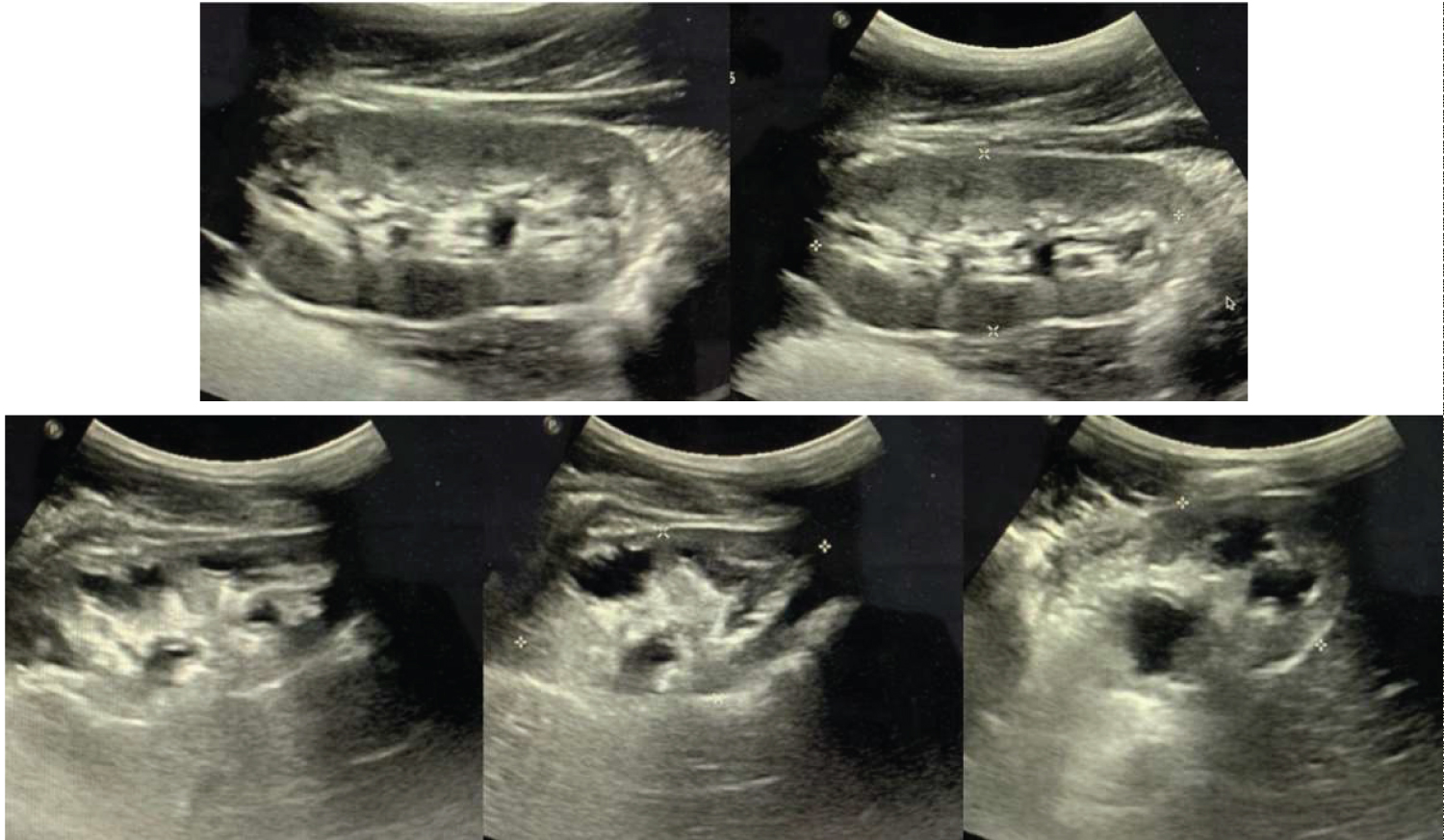 Figure 1: Kidney ultrasound demonstrating hydronephrosis and collecting system dilation of the right kidney (bottom images). The left kidney (top images), was also reported with hydronephrosis but does not show collecting system dilation.