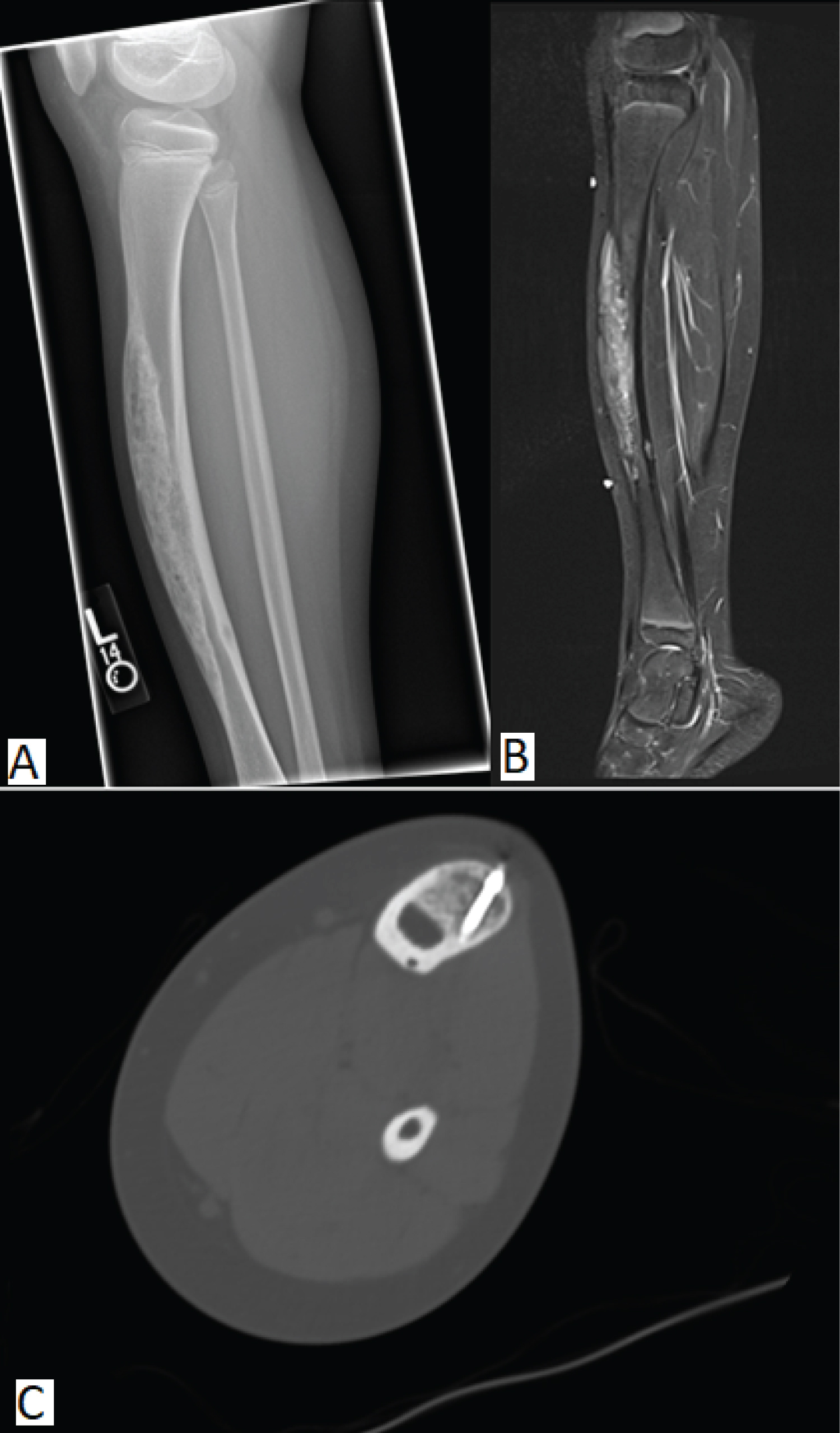Figure 1: (A) Expansile, heterogenous lesion arising from the anterior tibial cortex with lucent and sclerotic features. Posterior margins are partially obscured by sclerosis, but without periosteal reaction or soft tissue mass; (B) CT showing an infiltrative, 16.6 cm expansile lesion with its epicenter in the mid-tibial diaphysis with associated tibial bowing anteriorly and poorly defined proximal and distal margins; (C) STIR (short tau inversion recovery) revealing a lesion with heterogenous signal intensity with overall increased STIR signal.
