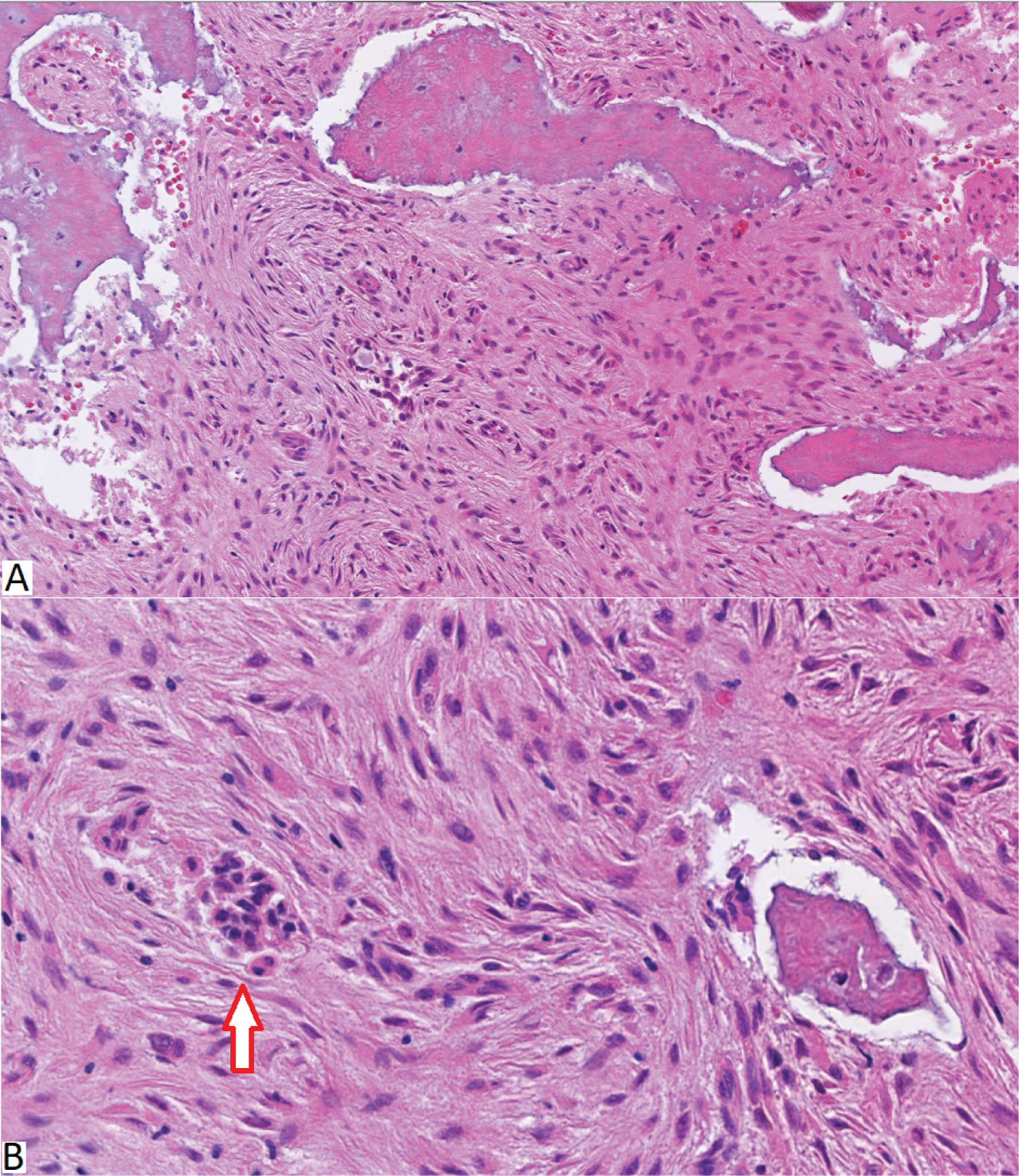 Figure 2: (A) H&E showing infiltrative fibro-osseous lesion of thickened woven bone and lamellar bony trabeculae embedded in loose fibrous stroma composed of bland spindle cells with occasional clusters of epithelioid cells. Here is a higher magnification showing the bland fibrous appearing spindle cells. The arrow points to epithelioid clusters of cells; (B) High power magnification showing the bland fibrous appearing spindle cells with epithelioid clusters of cells (Arrow).