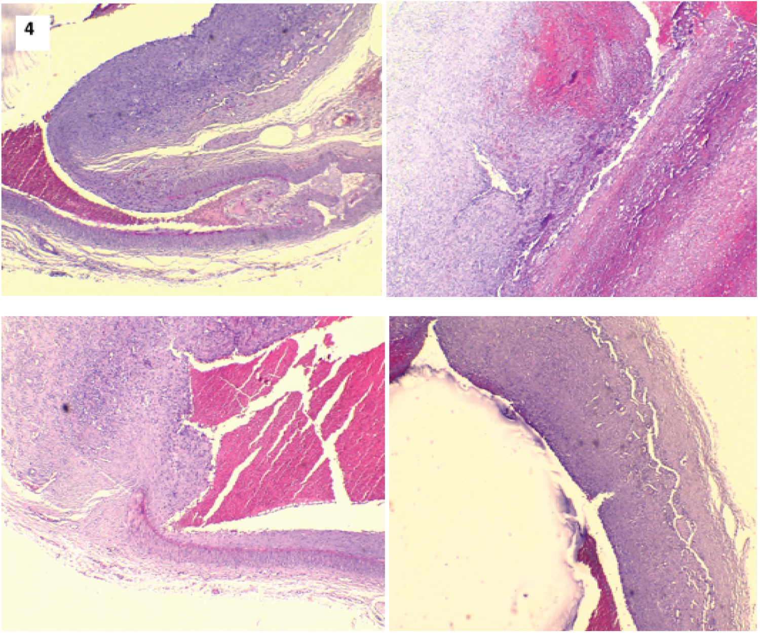 Figure 4: Histological examination of the aneurysm which showed: the appearance of the neck of the aneurysm and the interruption of the internal elastic limit and of the media.