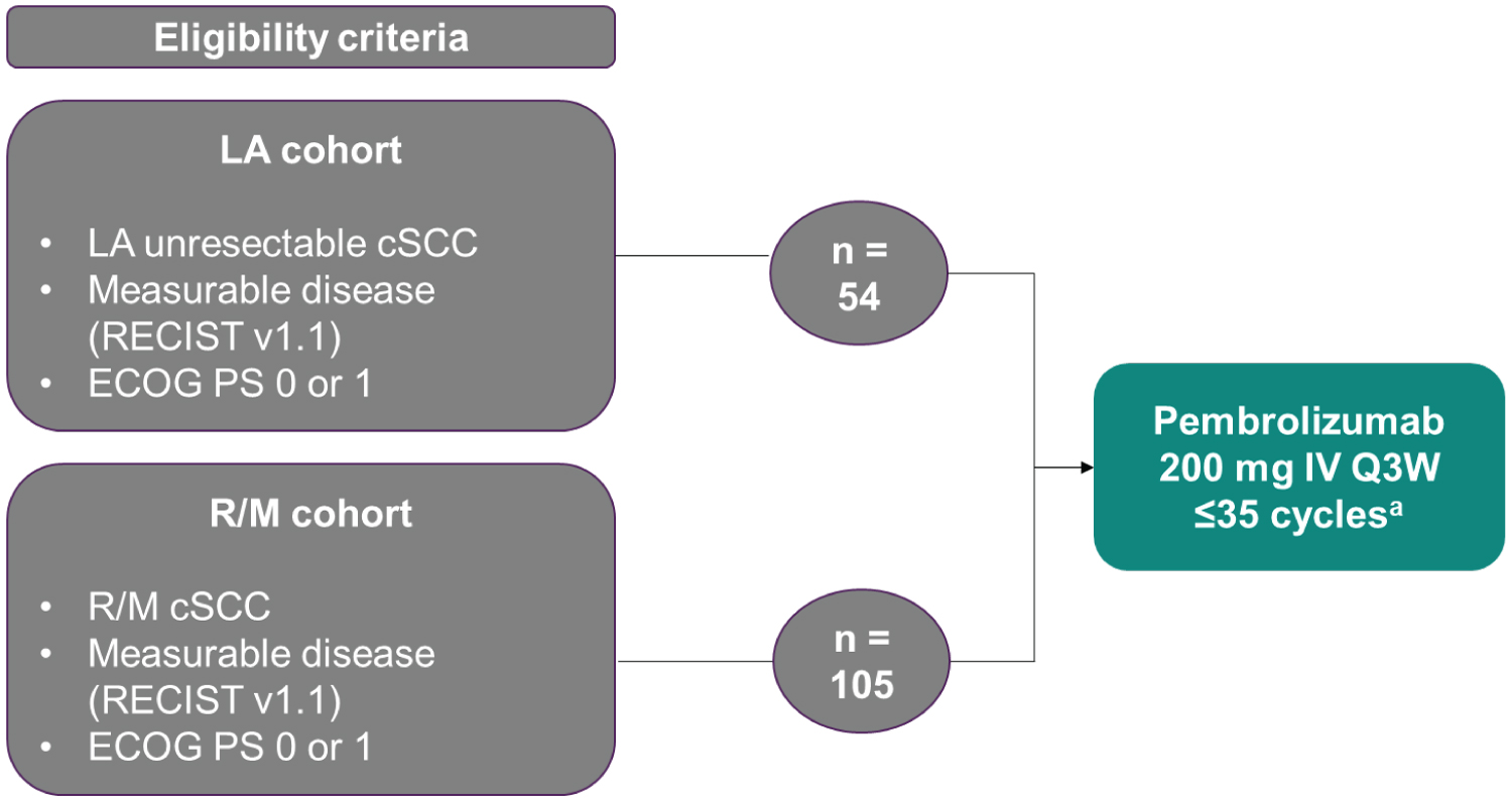 • Pembrolizumab monotherapy is approved in certain countries, including the US, for treatment of LA or recurrent/metastatic (R/M) cSCC not amenable to surgery based on results from the open-label phase 2 KEYNOTE-629 trial (NCT03284424) [4]