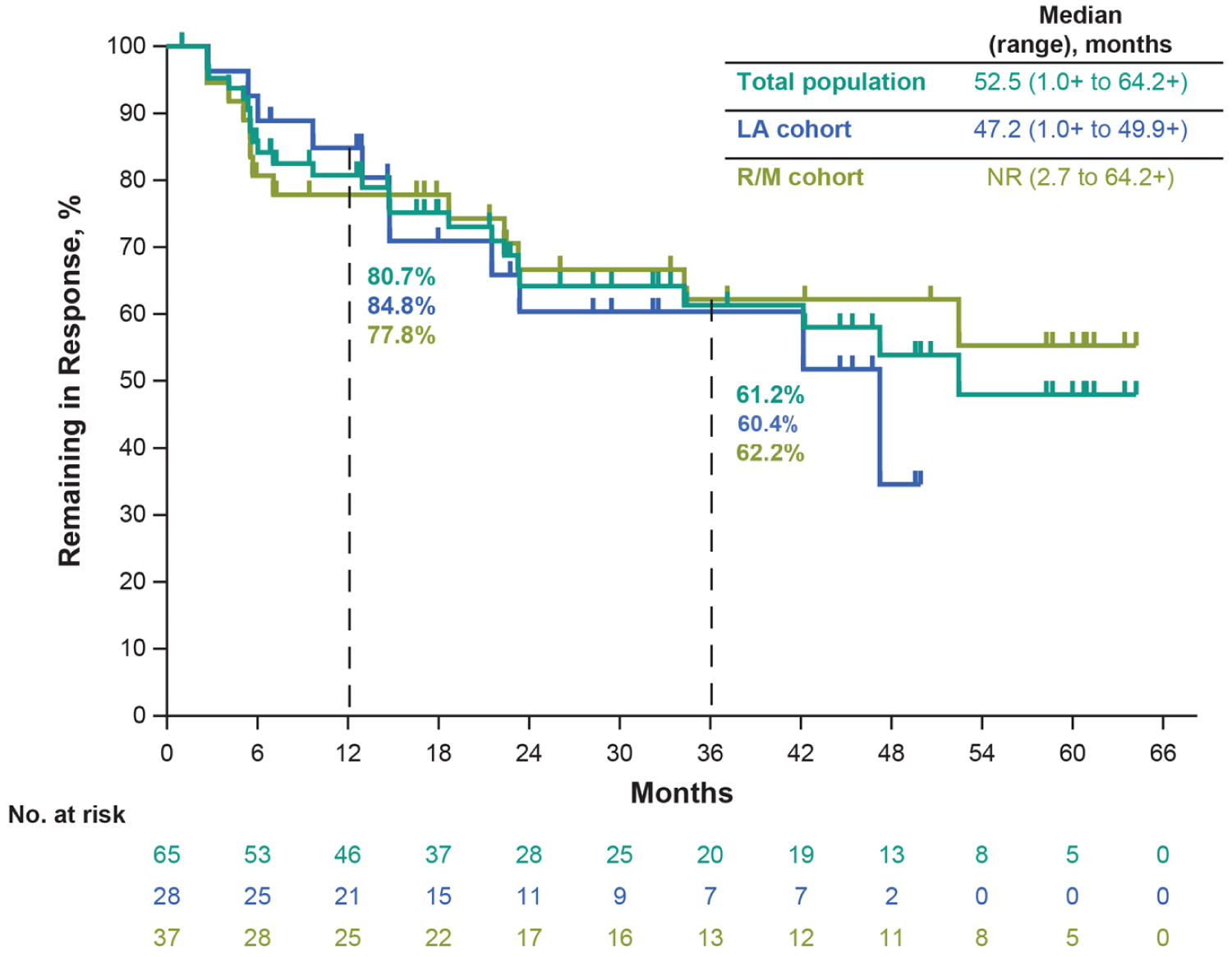 • Responses were durable, with a median DOR of 52.5 months and 61.2% of responders in the total population having extended responses that lasted ≥ 36 months