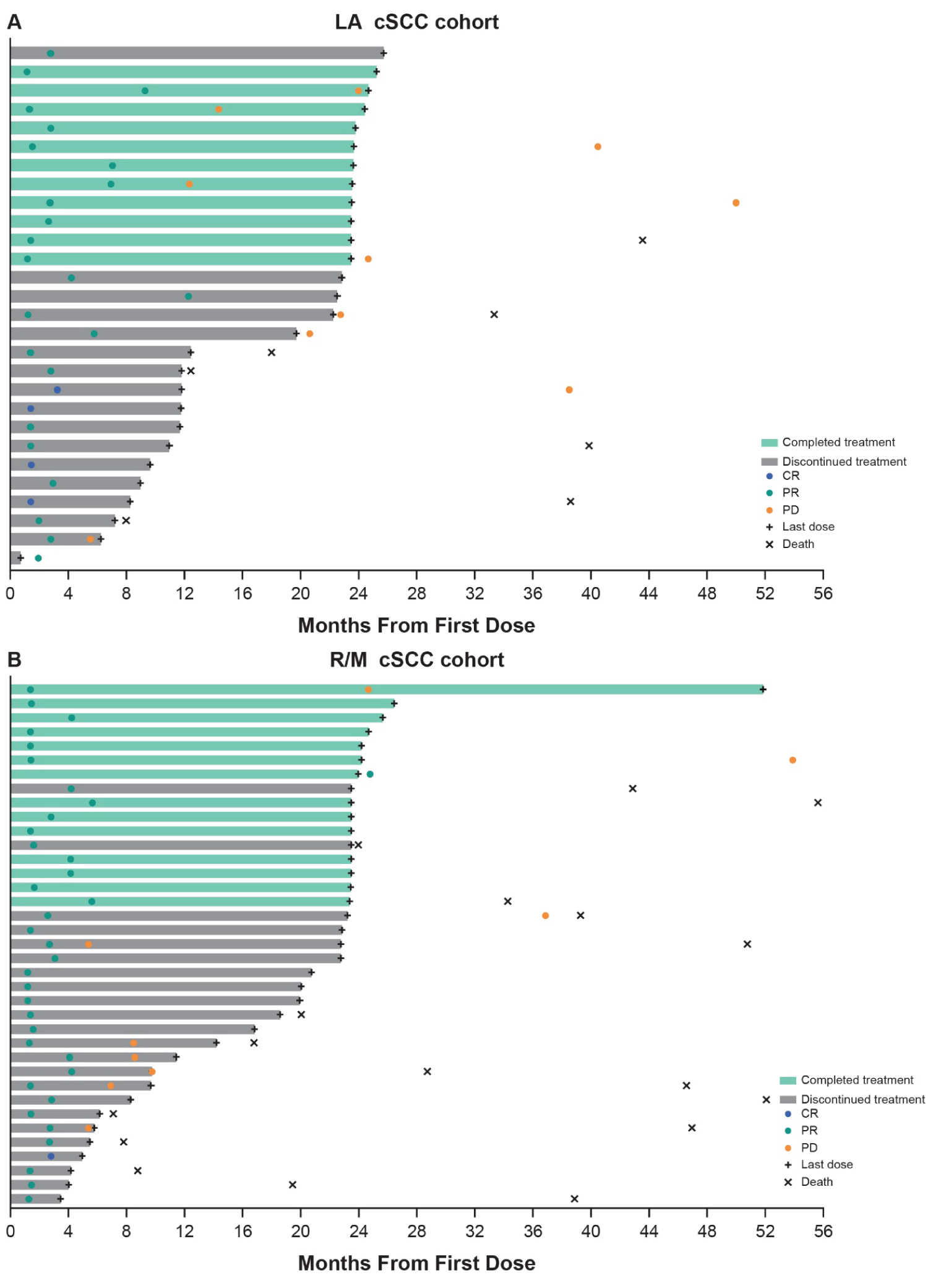 Figure 4: Duration of treatment and time to response in patients with a confirmed response per RECIST v1.1 by BICR in the (A) LAcSCC cohort and the (B) R/M cSCC cohort.