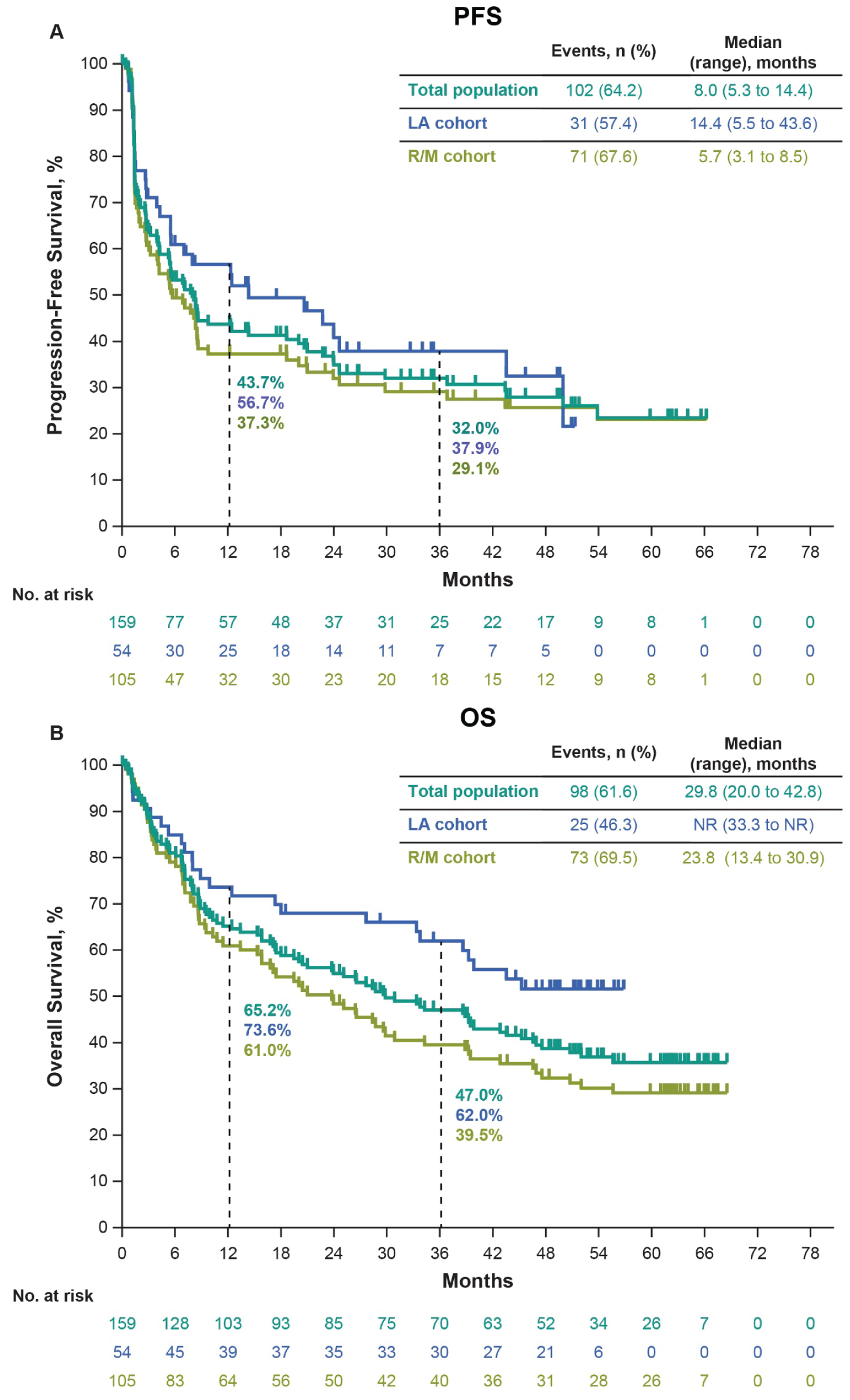 ○ Objective response rate (ORR) was 50.0% (95% CI, 36.1-63.9) with 9 (16.7%) complete responses (CRs) in the LA cohort and 35.2% (95%CI, 26.2-45.2) with 11 (10.5%) CRs in the R/M cohort