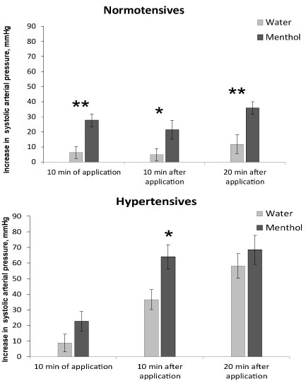 Figure 2: The increase in arterial systolic pressure when recovering from anesthesia in normotensive (top) and hypertensive (bottom) rats. Application of water - light bars, menthol - dark bars. Registration time is the 10th minute of the application, the 10th and 20th minutes after the end of the substance application. Significant difference between the parameters at water and menthol application: ** - P < 0.01; * - P < 0.05.