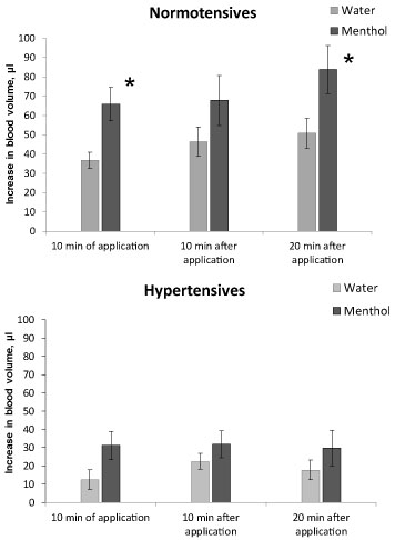 In hypertensive ones the rise in pressure when recovering from anesthesia under the influence of menthol did not change during the first 10 minutes of application, increased significantly 1.7 times 10 minutes after the end of the application and did not change 20 minutes after application (Figure 2, bottom). The rate of the arterial pressure increase 10 minutes after the end of the application was 1.2 ± 0.21 mmHg/min at water and 2.1 ± 0.26 mmHg/min at menthol application, P < 0.05, i.e. in hypertensives, the rate of pressure rise when using menthol increased only by 1.7 times and was observed for a shorter time (only during the first 10 minutes). So, hypertensives were less sensitive to menthol in context of arterial pressure rise.