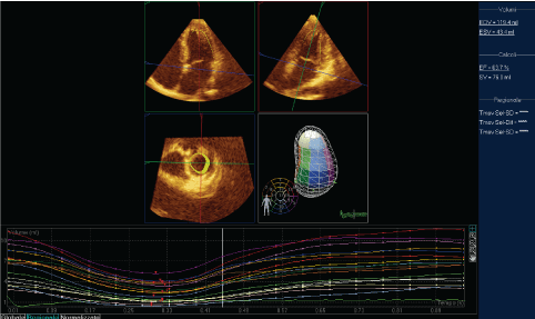 Figure 2: Three-dimensional echocardiography of Left Ventricle (LV). EDV (End Diastolic Volume): 119.4 ml; ESV (End Systolic Volume): 43.4 ml; EF (Ejection Fraction): 63.7%; SV (Stroke Volume): 76.0 ml. The silhouette of LV in systole and diastole is also recorded. Uniform motility of LV fibers (below). View Figure 2