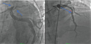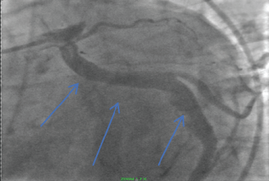 Figure 4: Ectatic circumflex coronary artery (Blue arrows). View Figure 4