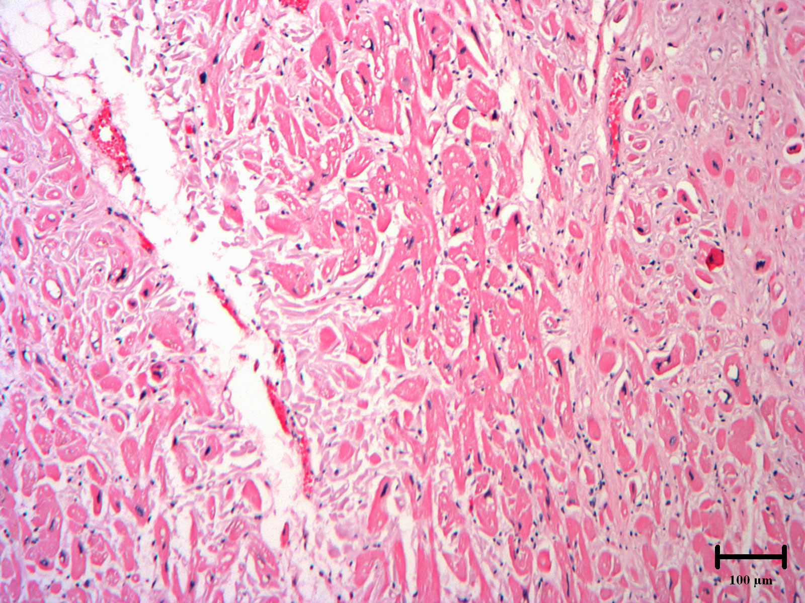 Figure 5: Autopsy heart section exhibiting the histology of hypertrophic cardiomyopathy. 100× magnification. H&E staining reveals enlarged and disarrayed myocytes with hyperchromatic nuclei and intercellular fibrosis.