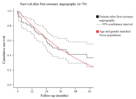 Figure S1: Estimated survival after first coronary angiography (n = 74) with 95% confidence interval and mean survival of an age and gender matched Swiss population.