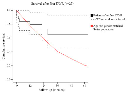 Figure S2: Estimated survival after first TAVR (n = 25) with 95% confidence interval and mean survival of an age and gender matched Swiss population.