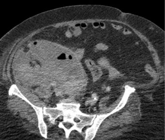 Figure 1: Large hematoma on psoas, oblique muscles and peritoneal cavity that displaces the right kidney in the anterior way, bladder and uterus.