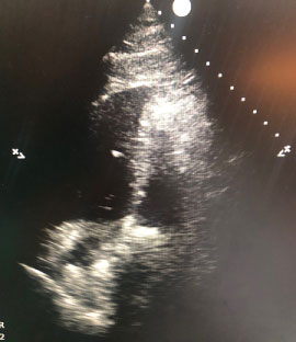 Figure 2: Linear mobile density in the right atrium that displaces atrial septum.