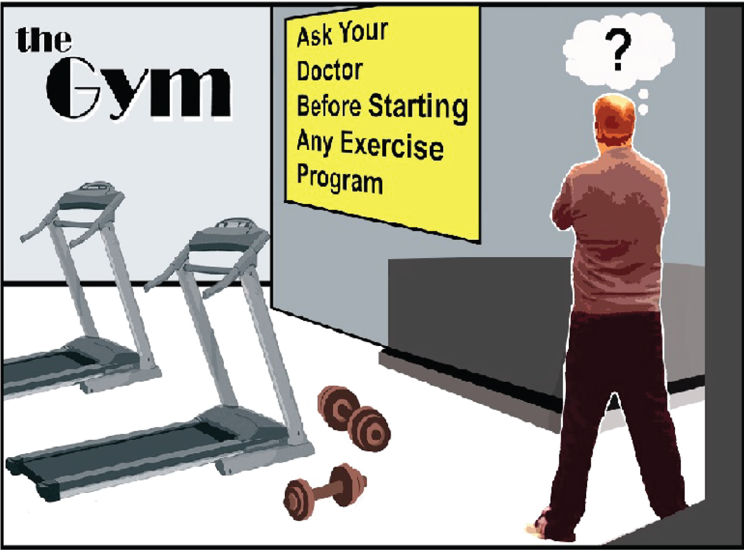 It is understandable that patients often lack, and struggle to understand, risk related information. They typically do not think about the nature and magnitude of risk at issue, and they may know little about the various consequences of risk reduction. Often assessment of risk, especially when the risk includes death, is handled with emotions and intuitive thinking. Most exercise facilities typically have the visually salient nudge: "Ask Your Doctor before Starting Any Exercise Program" (Figure 1).