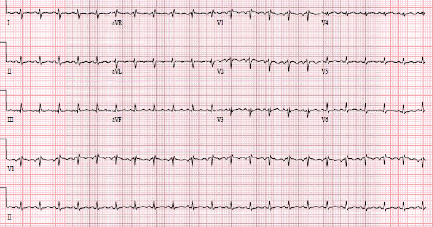 Figure 1: Sinus tachycardia with loss of R waves across the precordium and non-specific ST changes.
