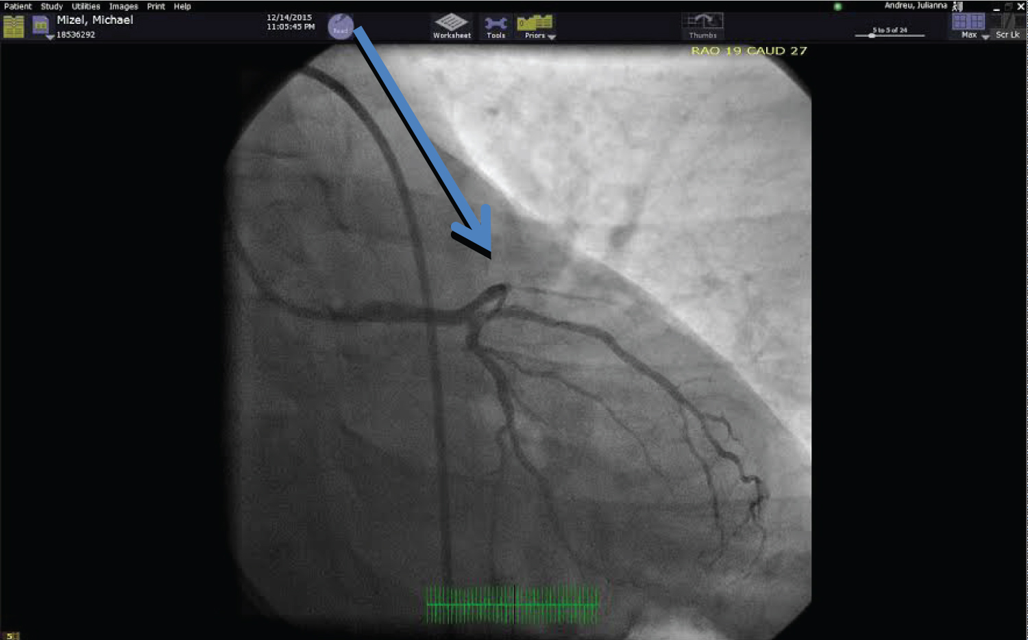 Figure 4: Coronary angiography reveals an occluded LAD (Blue arrow).