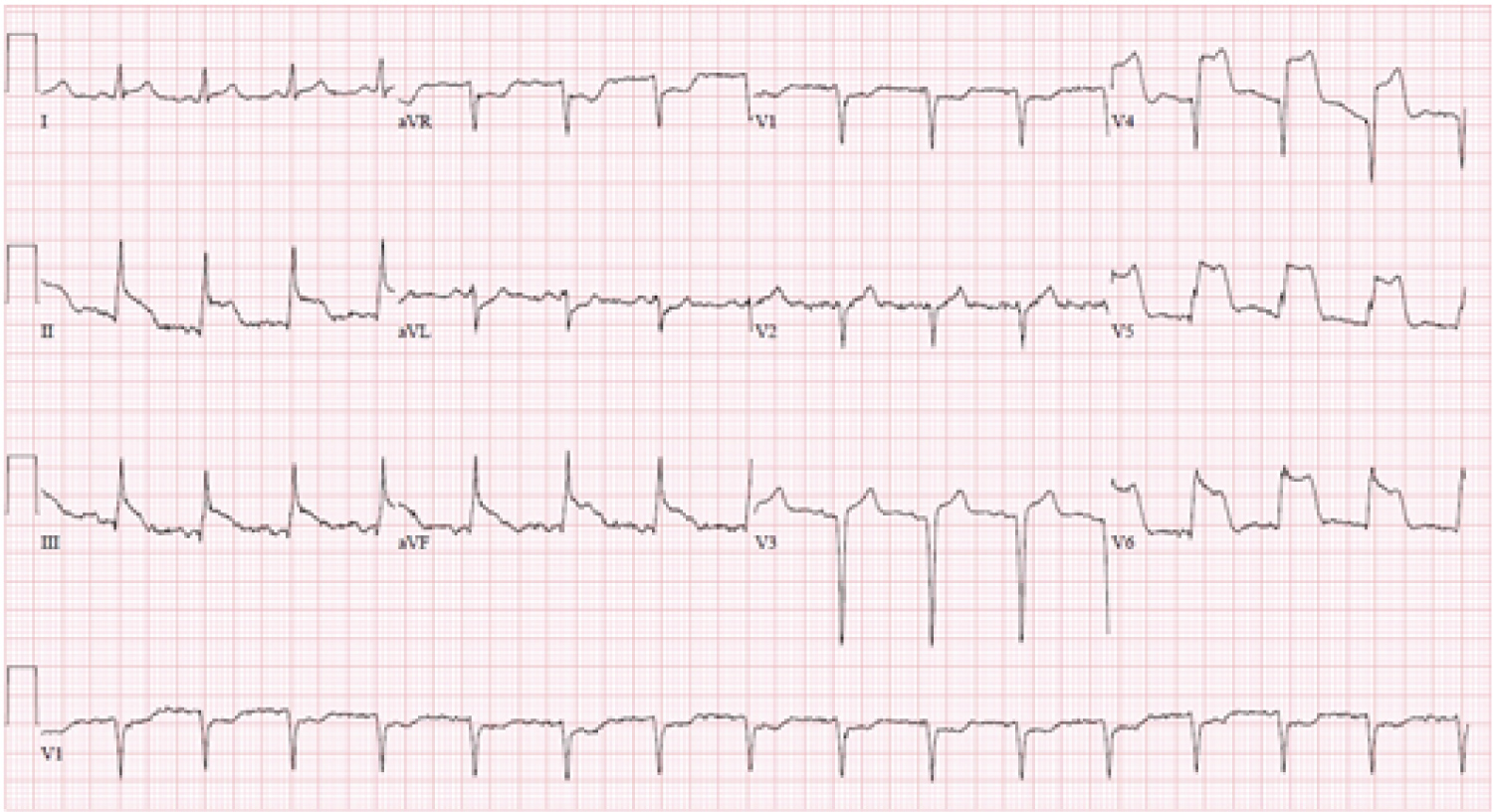 Resting at home, she developed chest pain, nausea, and loss of consciousness. Emergency medical services were summoned and the paramedics performed an ECG revealing ST elevation inferolaterally (Figure 5). Upon arrival to the emergency room, she developed ventricular fibrillation requiring cardiac defibrillation to restore sinus rhythm.
