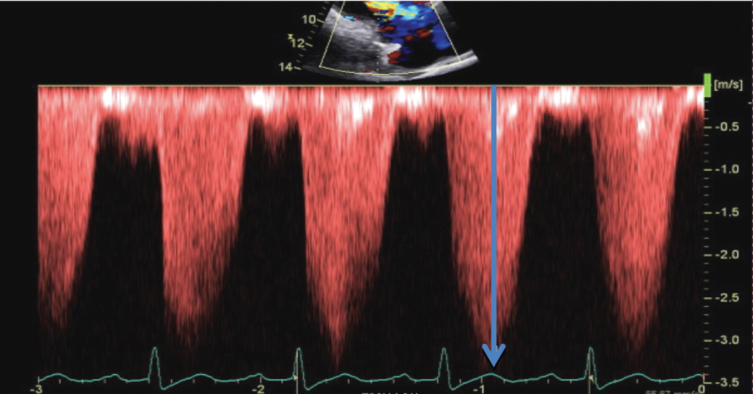 Figure 2: TR envelope: Blue arrow to 3.5 m/sec. The RV-RA gradient is approximately 50 mmHg.