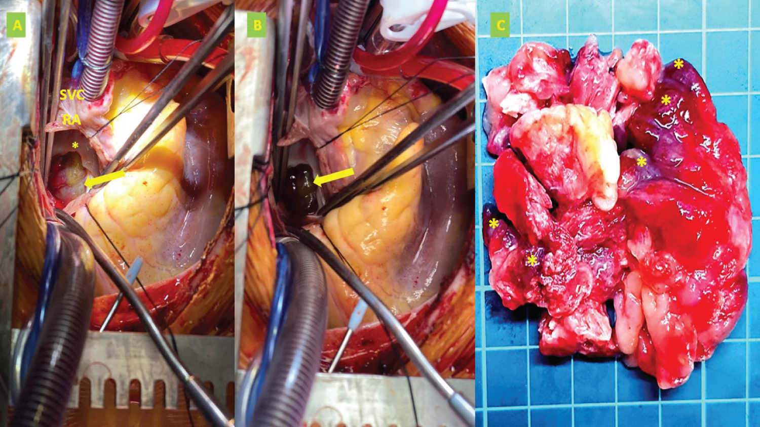 Figure 2: (A) Cardiac surgery view through the open right atrium with partial resection of the interatrial septum; the yellow arrow shows the myxoma Partial resection of the interatrial septum (*); (B) Same view as in A; the yellow arrow shows hemorrhagic and congestive pedicle areas; (C) Macroscopic anatomic pathology showed a tumor with irregular borders, with a myxoid appearance, soft consistency, light color and hemorrhagic and congestive areas (*).