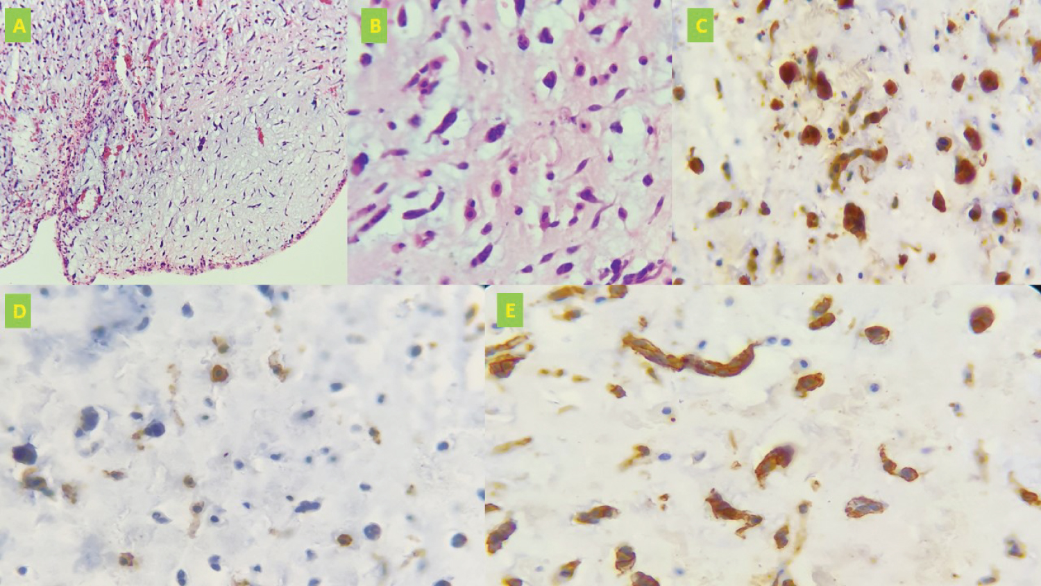 Figure 3: Microscopic anatomic study (A) Hematoxylin-eosin coloration, 10X magnification, showing vascularized myxoid stroma and elongated neoplastic cells with eosinophilic cytoplasm and ovoid nuclei; (B) 40X magnification showing sparse eosinophilic cytoplasm and nuclei with homogeneous chromatin; (C) Immunohistochemical markers (nuclear and cytoplasmic calretinin positive); (D) Immunohistochemical markers (CD31 positive); (E) Immunohistochemical markers (CD34 positive).