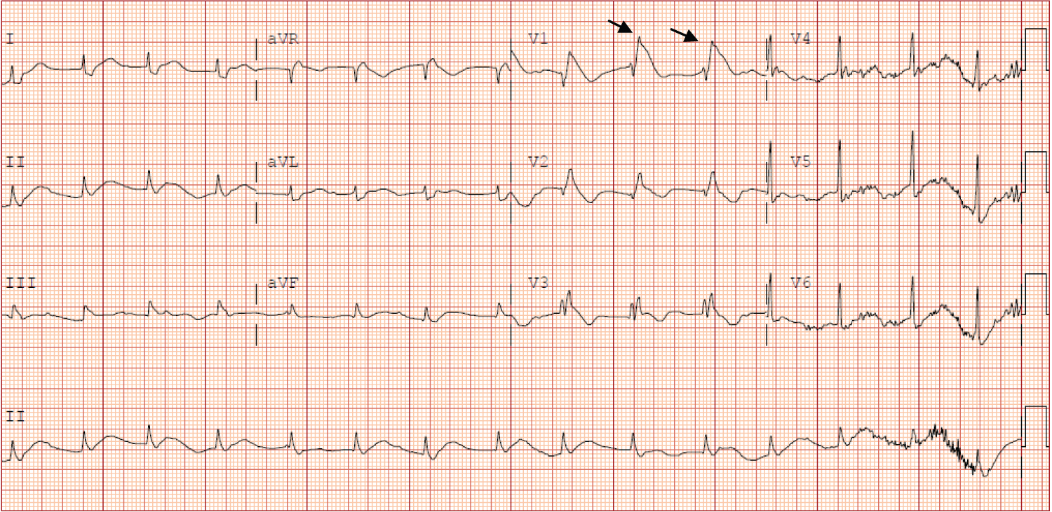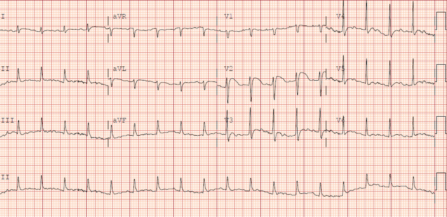 Patient's past medical history was notable for alcohol use disorder, with consumption of 18-20 beers per day, and intermittent intranasal cocaine consumption. Family member reported that patient had been abstinent for 2 weeks prior to the visit. There was no known history of smoking or drug allergies or any sudden cardiac death in the family.