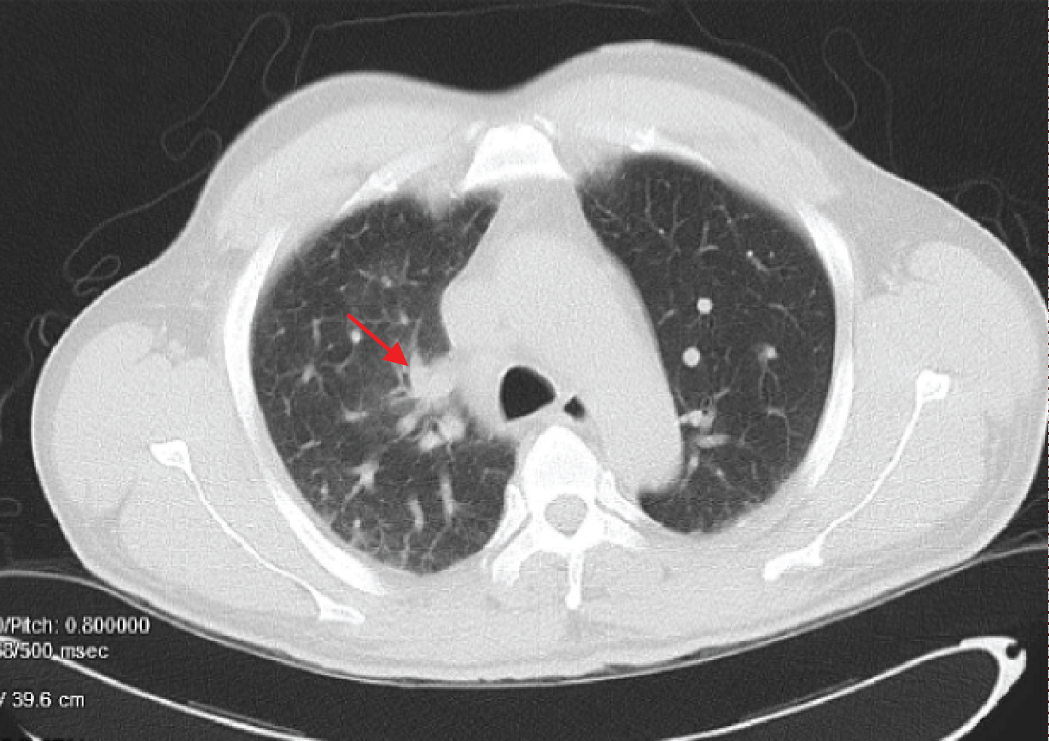 Figure 1B: CT of the chest-abdomen-pelvis revealed right suprahilar peribronchial ground-glass opacity (red arrow), mild cardiomegaly, trace peripheral vascular congestion and mild hepatomegaly.