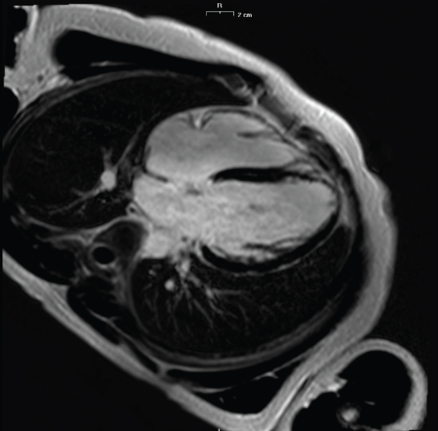 Figure 5: Cardiac magnetic resonance shows: Slightly dilated left ventricle; subendocardial late enhancement of the distal portion of the septal and anterior apex.