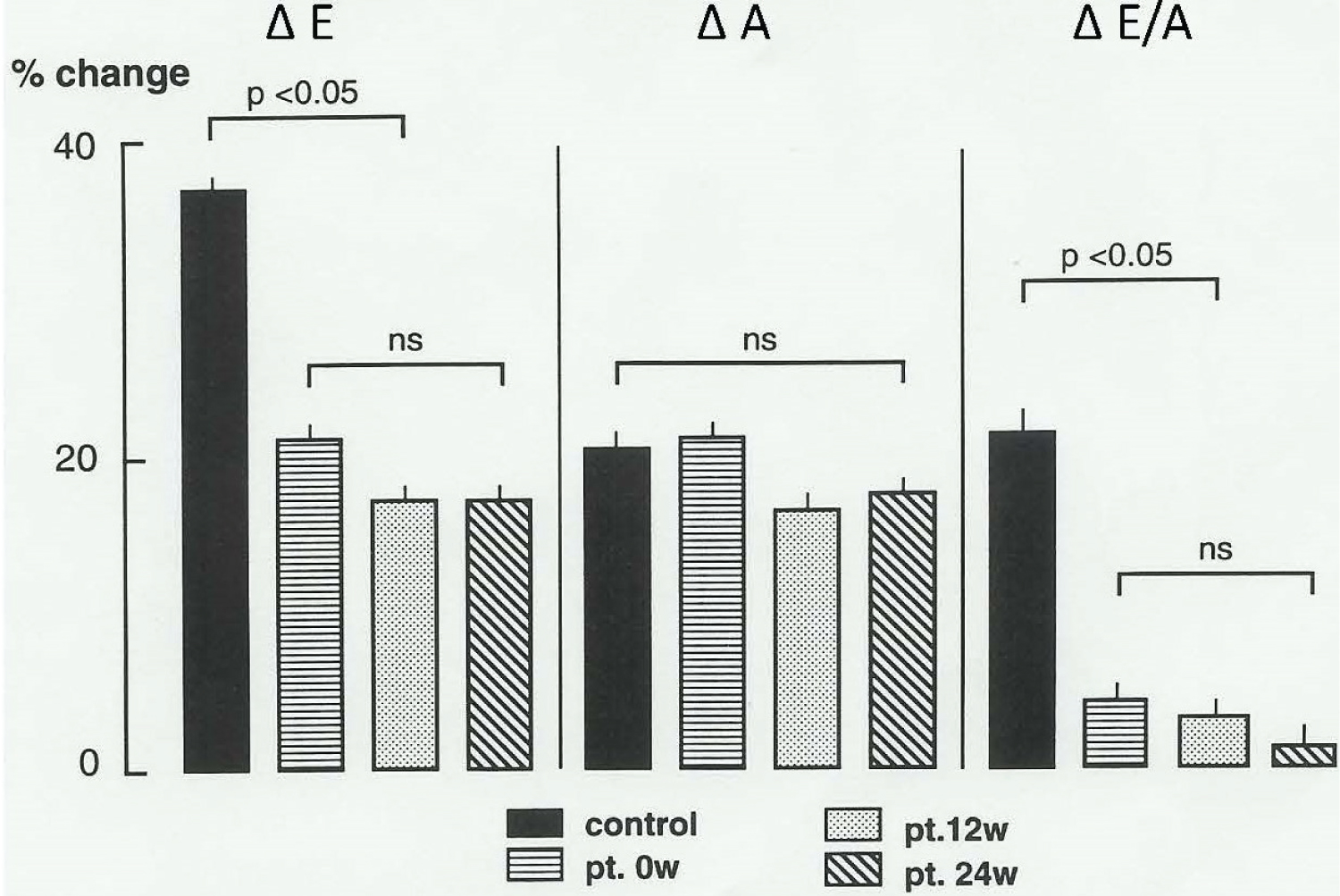 ΔE: Early left ventricular filling (percent change); ΔA: Late left ventricular filling (percent change); ΔE/ A: Ratio of filling waves (percent change); ns: Not significant; Control: Normotensive patients
