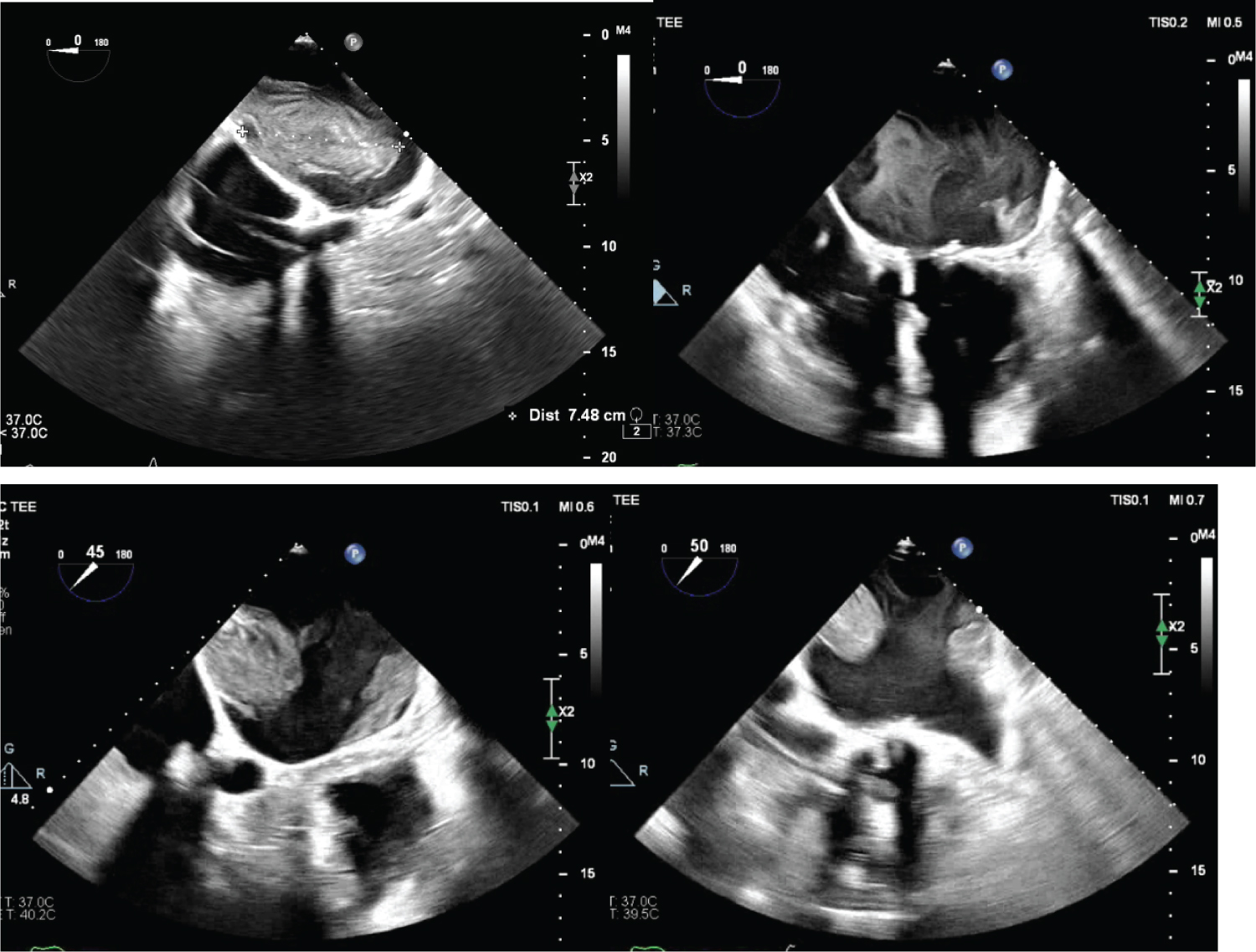 The length of one of the thrombi is measured at 7.48 cm in the left upper image. Two separate thrombi can be seen in the left lower image. Interestingly, the left atrial appendage in the right lower image is without a thrombus.