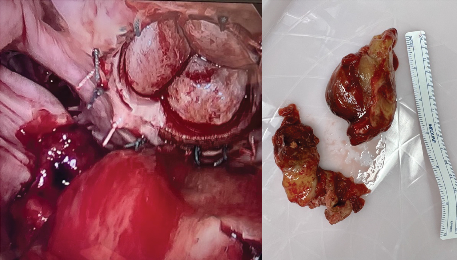 57-year-old female with a history of bioprosthetic mitral valve replacement 6 years prior (27 mm Carpentier Edwards), rate-controlled atrial fibrillation s/p dual-chamber pacemaker on warfarin, and nonischemic cardiomyopathy with reduced ejection fraction of 35%. Patient presented to the hospital for 3 days for worsening shortness of breath. Given concerns of known upper extremity thrombosis, a computerized tomography scan of the chest with contrast was used to rule out a pulmonary embolism and showed an enlarged left atrium with large filling defect. INR on admission was 2.8. On transesophageal echocardiogram (TEE) the next day, there was found to be multiple large left atrial thrombi (largest measuring 7.48 × 3.12 cm), with a significantly dilated left atrium thought to be secondary to a severely stenotic mitral valve. On discussion with the multidisciplinary heart team, we decided to proceed with redo surgical mitral valve replacement and thrombus removal (Figure 1).