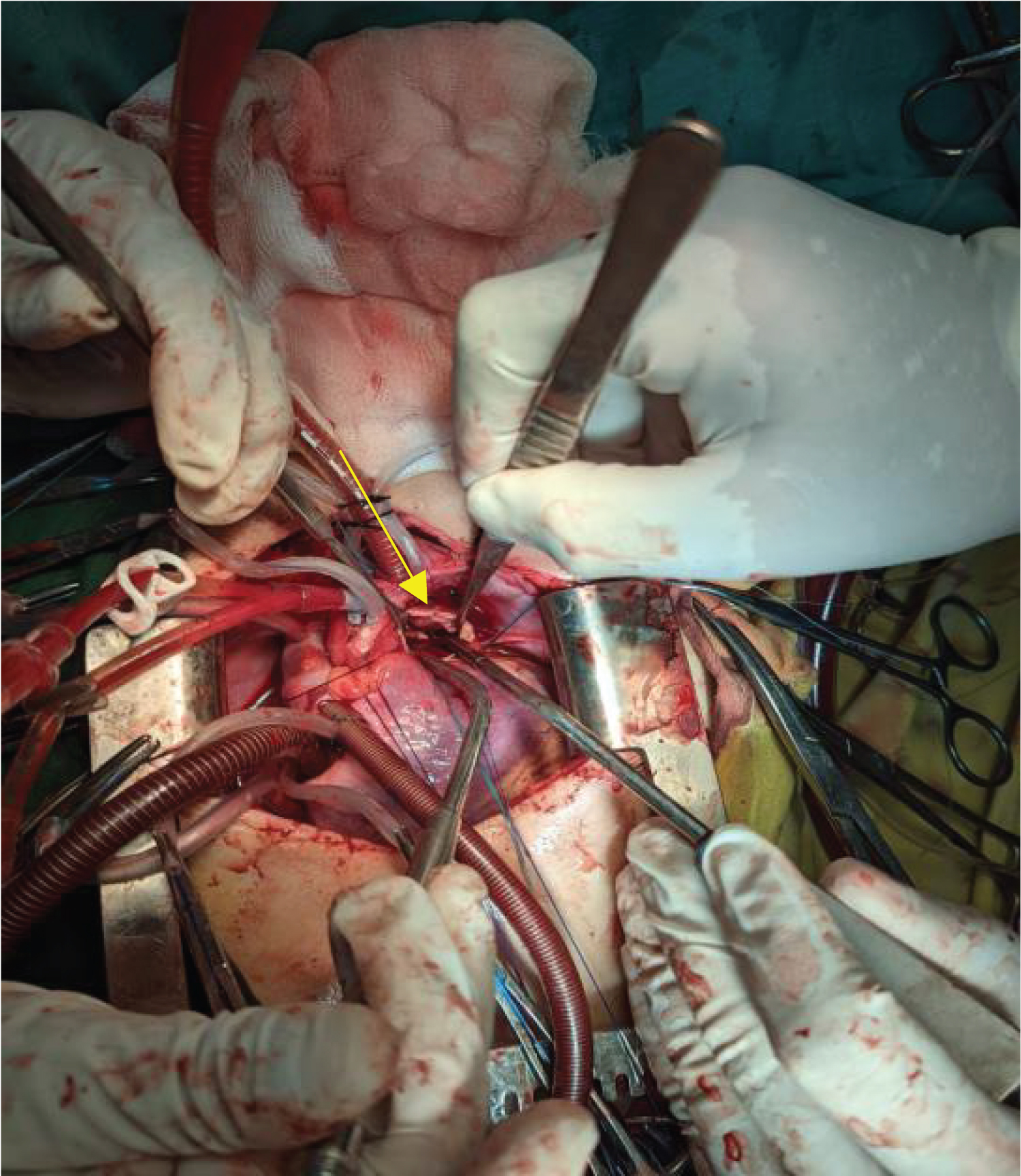 Regarding the length and size of the patent ductus arteriosus, the patient was in need of surgical intervention. Depending on the age of the patient and the size of the PDA, a median sternotomy was performed. After opening the chest wall, the heart contractility was good, with a normal average size. Searching for PDA took about 30 minutes; it was deep, short, and large (12-14 mm). Then we measured the direct pressure from the aorta and pulmonary artery, which revealed the similarity of pressure and indicated the possibility of irreversibility. More than 30 minutes were given to discussion with the pediatric cardiologist for the best next step and with the patient's family. Eventually, direct closure through the pulmonary artery by using a pericardial patch was the final decision to make for this young girl. The heart was connected to the cardiopulmonary machine, but without using cardioplegia (off-pump), an incision was made through the pulmonary artery, and we started to implant the patch after identifying the site of the PDA. By using Proline 5-0, we stitch the pericardial patch to the PDA opening using the matrix method to give a chance for future residual shunting formation. Decannulation was done smoothly, with good local homeostasis and closure of the chest (Figure 1).