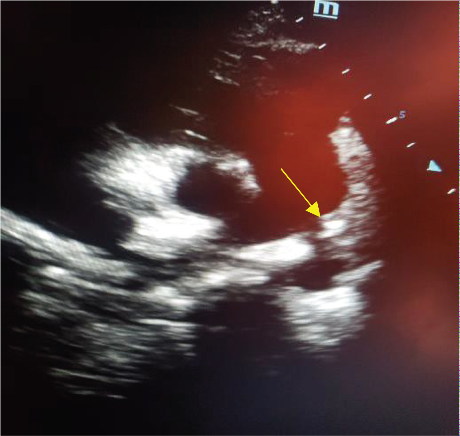 Figure 2: Echocardiography post-operative demonstrate the closed PDA and pericardial patch with residual shunt (the arrow), Dr. H. Al-Fakih, Cardiologist MD.
