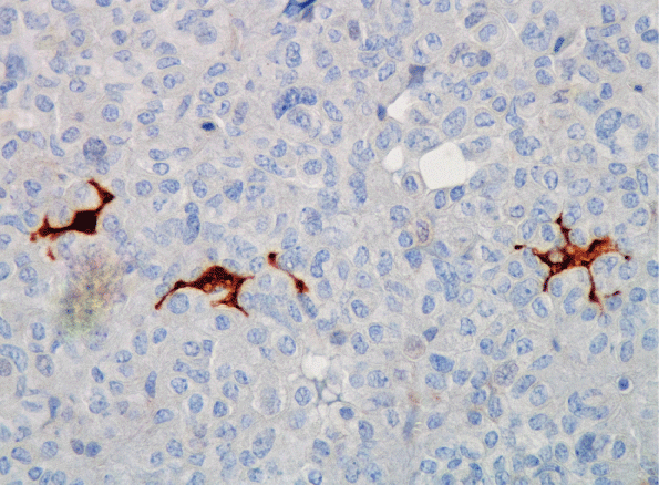 Clues to FSC function should also be able to be gleaned from the morphological similarities they share with brain astrocytes, dendritic cells in the lymph tissue, Langerhans cells of the skin, sustentacular cells in the adrenal gland and Sertoli cells in the testis. Interestingly, all of these cells are positive for the S-100 protein [4]. For example, they are believed to have a supportive role similar to that played by the S-100-positive sustentacular cells of the adrenal medulla and paraganglia.