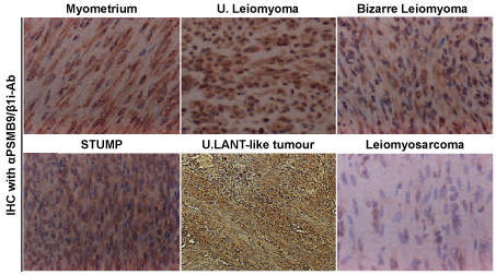 Figure 1: Differential expression of PSMB9/β1i in human normal myometrium, several mesenchymal tumour types and uterine LANT-like malignant tumour. Immunohistchemistry (IHC) of PSMB9/β1i in normal myometrium, usual leiomyoma, Bizarre leiomyoma, Smooth Muscle Tumour of Uncertain Malignant Potential (STUMP) and Uterine Leiomyosarcoma (LMS) tissues located in same tissue, and uterine LANT-like malignant tumour. For all samples, 5-µm sections of tissues specimens were stained with anti-PSMB9/β1i antibody revealed by peroxidase-conjugated anti-rabbit IgG antibody.
