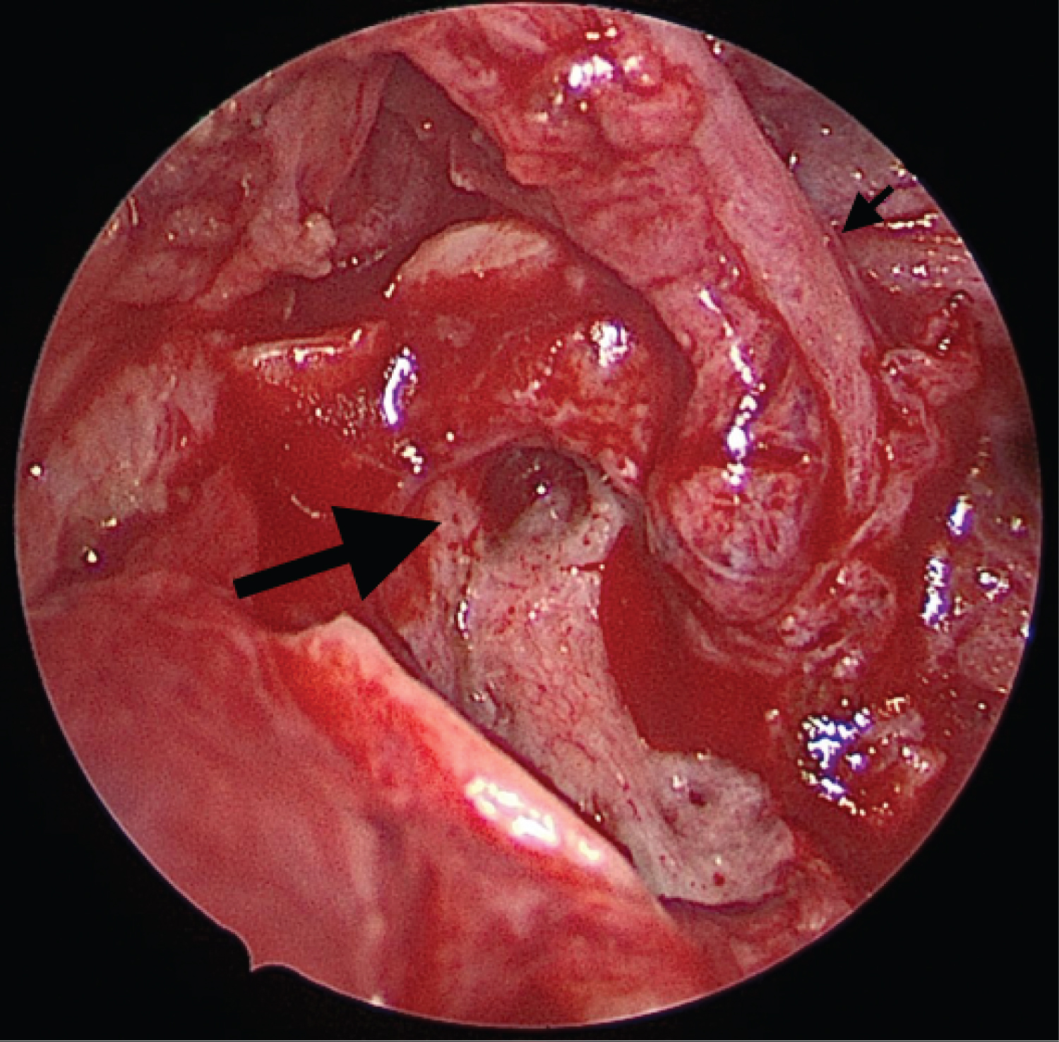 Figure 4: Cartilaginous portion of the branchial cleft cyst with close association of facial nerve. Small arrow: Root of the facial nerve; Large arrow: Cartilaginous portion of the branchial cleft cyst running deep to the facial nerve. View Figure 4