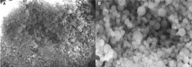 Figure 2: SEM images of quaternary halomethylated ammonium iodide incorporated in Precirol® nanoparticles (PC6I). A) 2,350X. B) 7,000X. Notice of Spherical shape of nanoparticles.